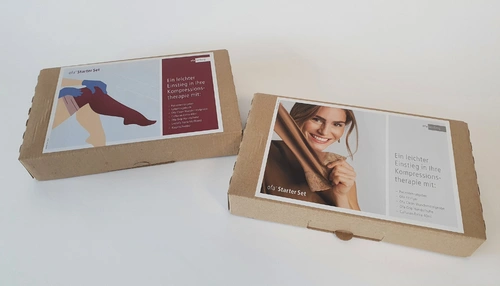 When patients begin their compression therapy, they can receive these little starter sets. For their packaging, we are transitioning from bags made out of plastic wraps to recycled cardboard.
