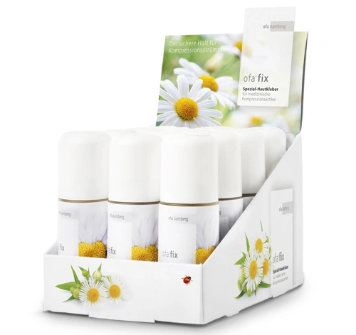 Ofa Fix huidkleefmiddel biedt eenvoudigweg een veilig houvast voor uw medische compressiekousen. Het pH-neutrale huidkleefmiddel met het natuurlijke bestanddeel van kamille is bijzonder zacht voor de huid.